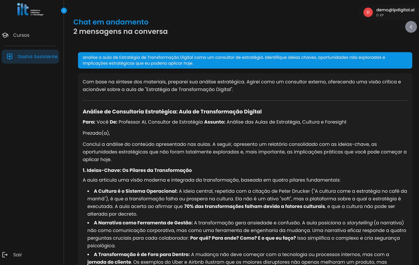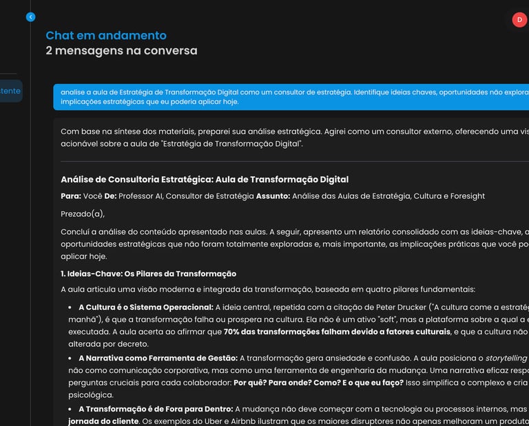 Agora você pode conversar diretamente com as aulas da Formação Executivo CTO. Apresentamos Sasha, sua mentora virtual — criada para guiar você em um aprendizado dinâmico, onde cada pergunta gera uma nova descoberta.