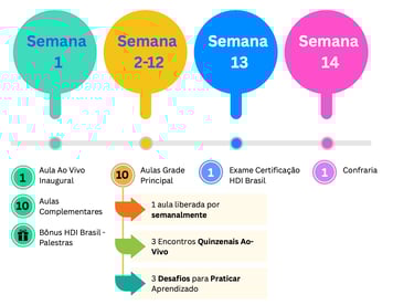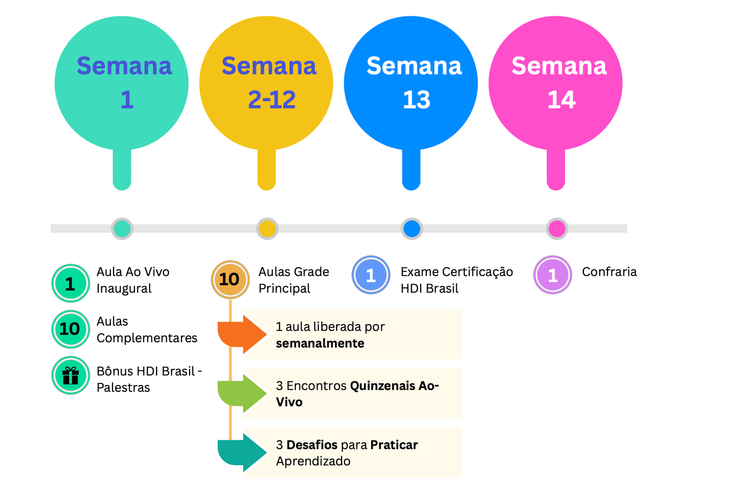 Sua jornada de aprendizagem combina três tipos de aulas. Grade Principal, Complementar e palestras bônus do HDI Brasil. Combinadas, elas te ajudaram a transformar teoria em visão estratégica, técnica em liderança inspiradora, e ideias em impacto real.