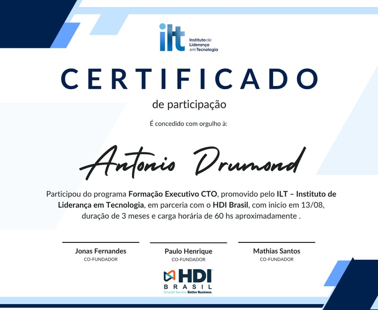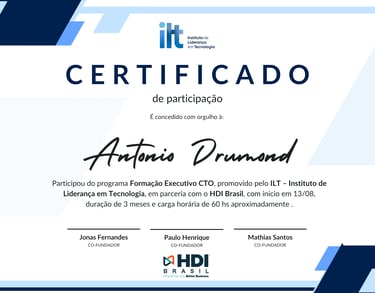 Ao conquistar seu certificado na Formação Executivo CTO, você comprova mais que conhecimento: evidencia coragem para inovar, liderança para transformar e visão estratégica para inspirar equipes. Um reconhecimento que impulsiona sua trajetória e abre portas para novos desafios e oportunidades no cenário tecnológico aplicado ao negócio.